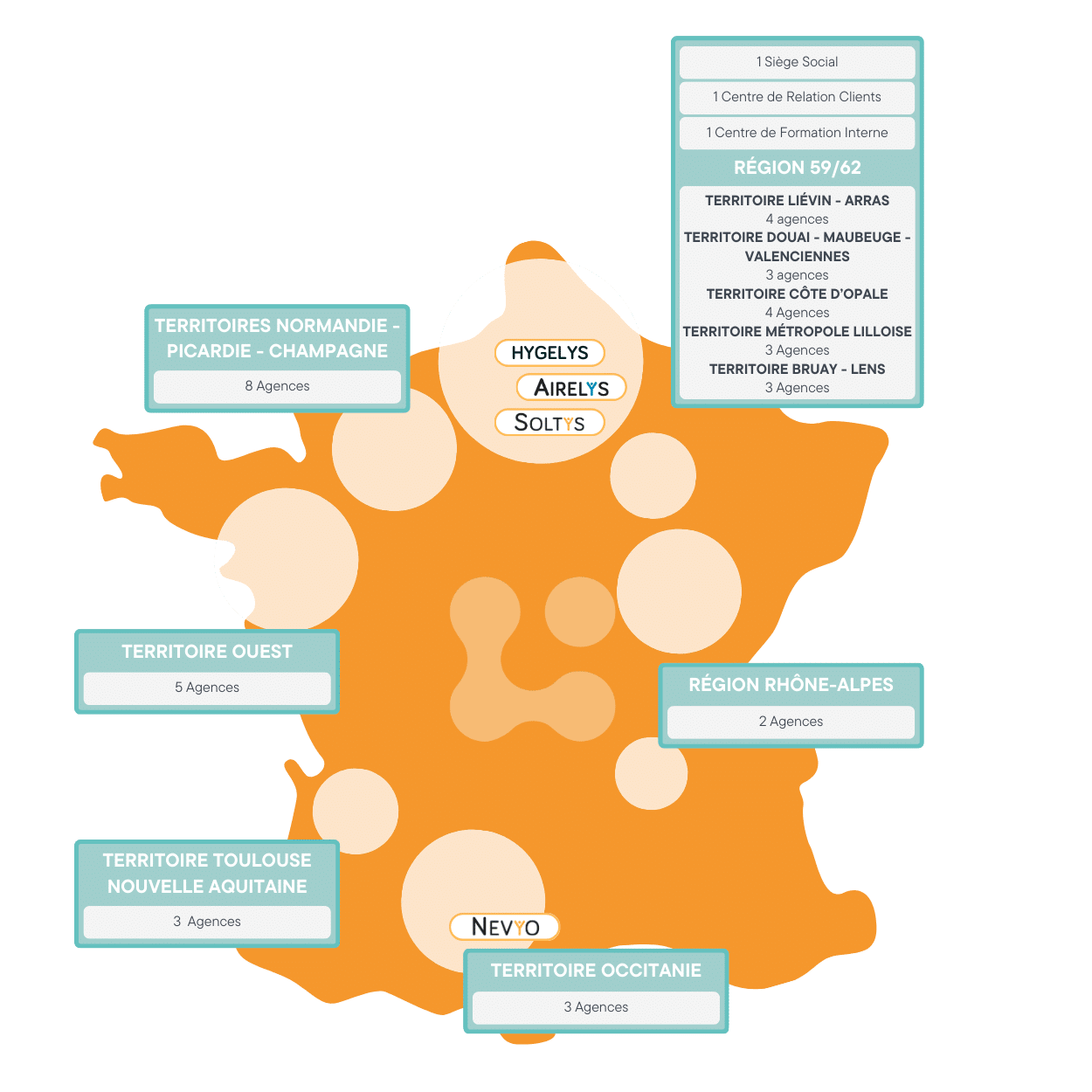 Nous disposons de 45 agences et sites implantés sur l’ensemble du territoire national. Au plus proche des parcs de logements de nos clients Bailleurs Sociaux et de nos Clients Particuliers, nos Technicien(ne)s Multiservices et Spécialistes effectuent diverses opérations de maintenance préventive et curative au sein des logements dans toute la France.